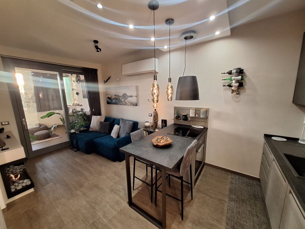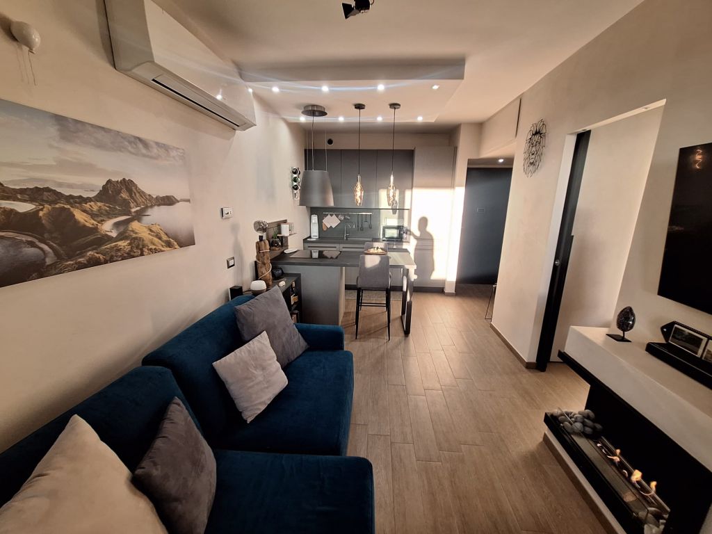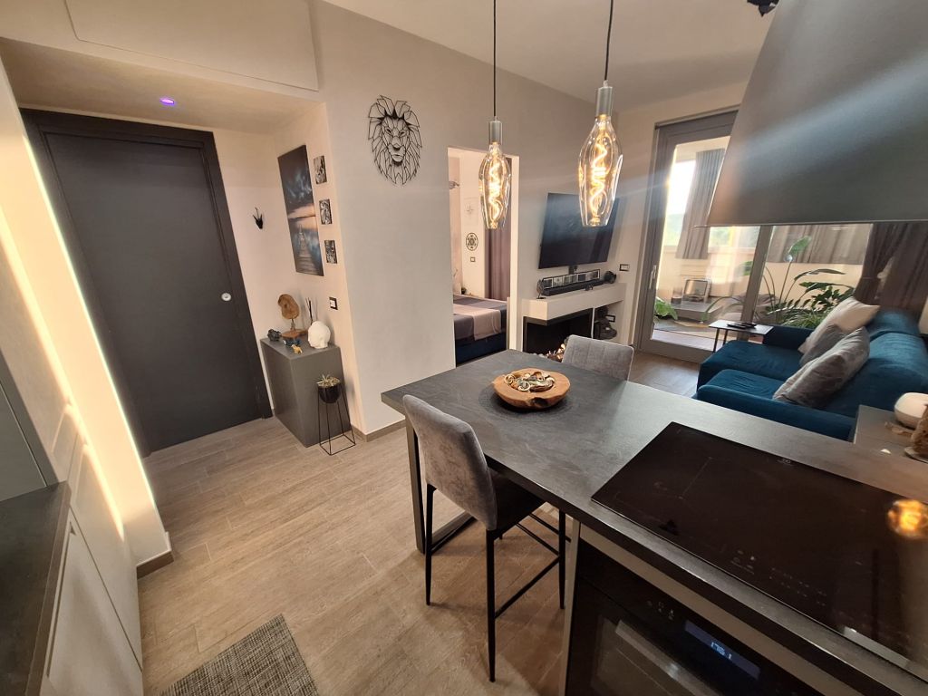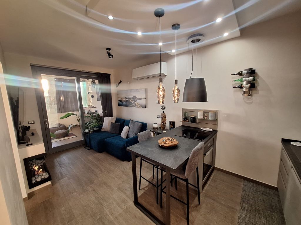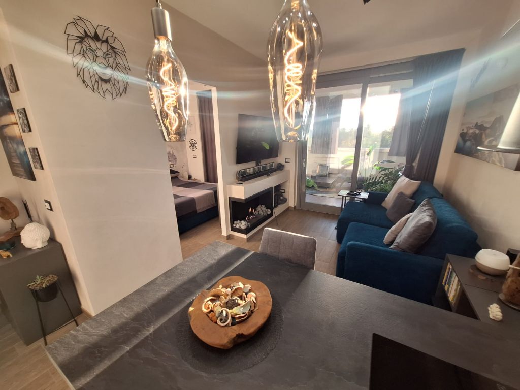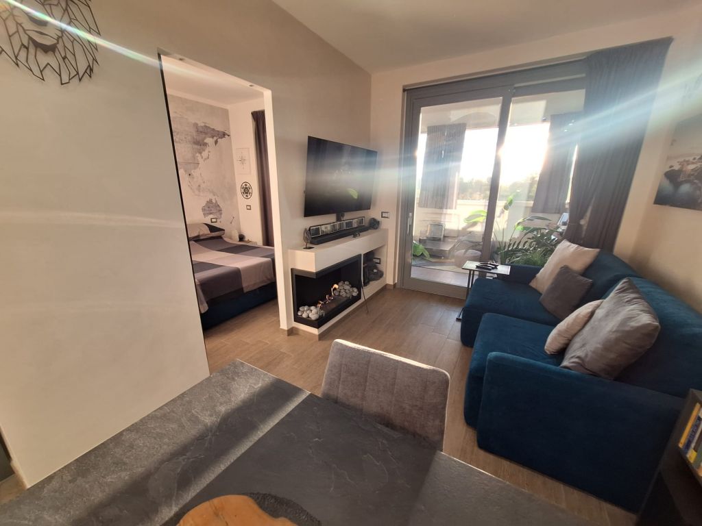 L'immobile è in perfette condizioni interne e si vende arredato con materiali di qualità e design. L'appartamento si compone di accogliente zona living con angolo cottura, camera da letto, bagno. Sia dalla camera da letto che dalla zona living si può accedere all'elegante e funzionale terrazzo vivibile tutto l'anno grazie alle comode vetrate scorrevoli e l'aggiunta di un condizionatore "UNICO" che funziona sia da aria fredda/calda.