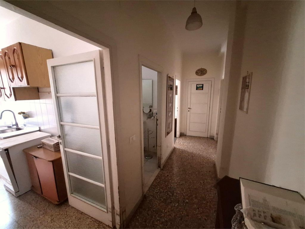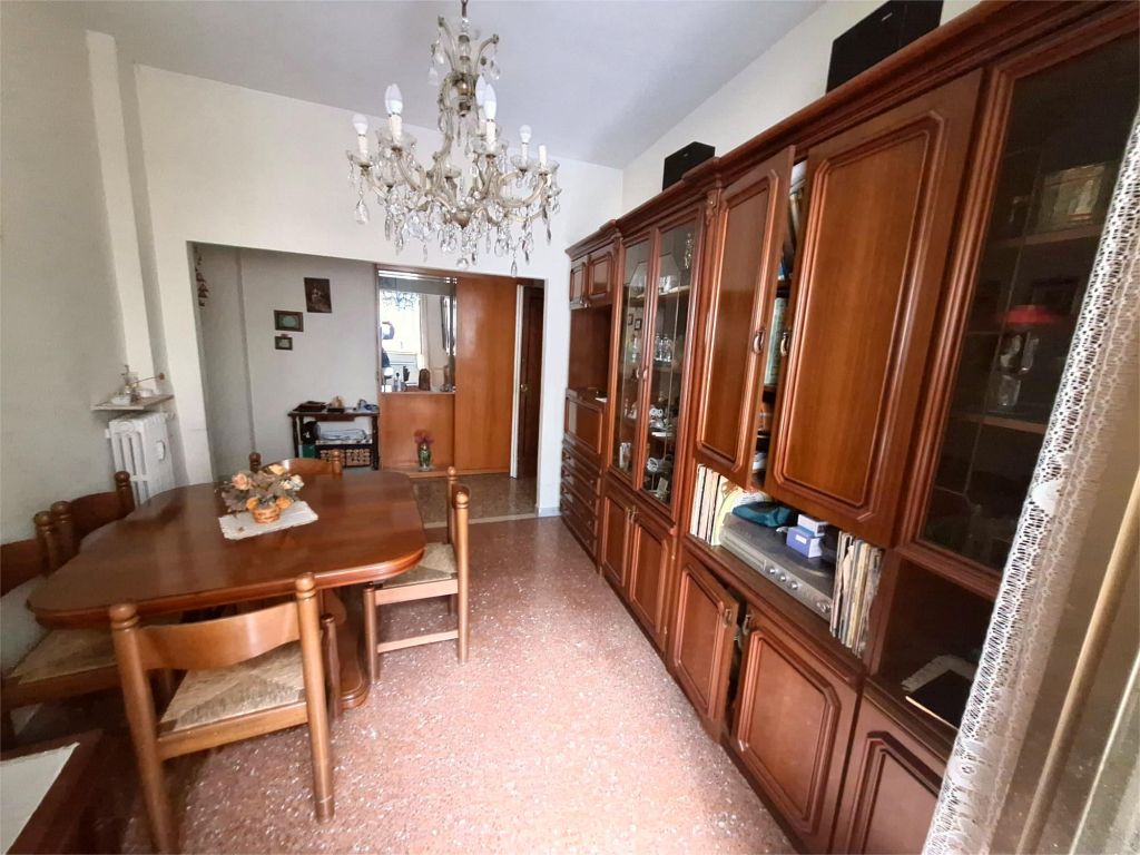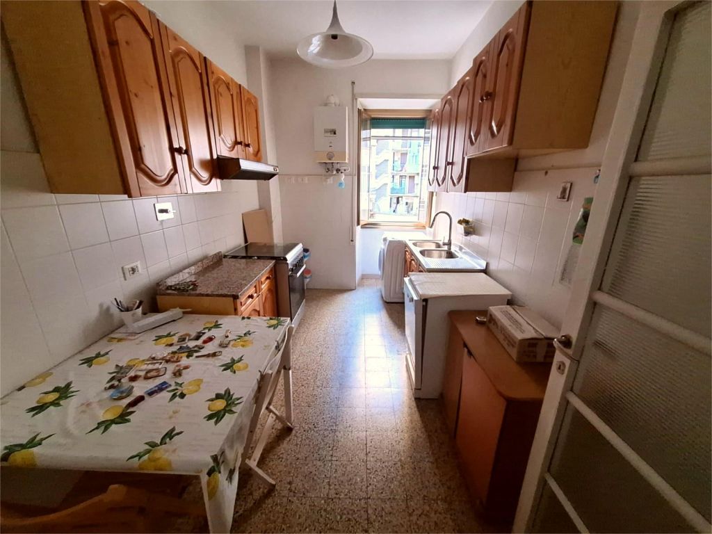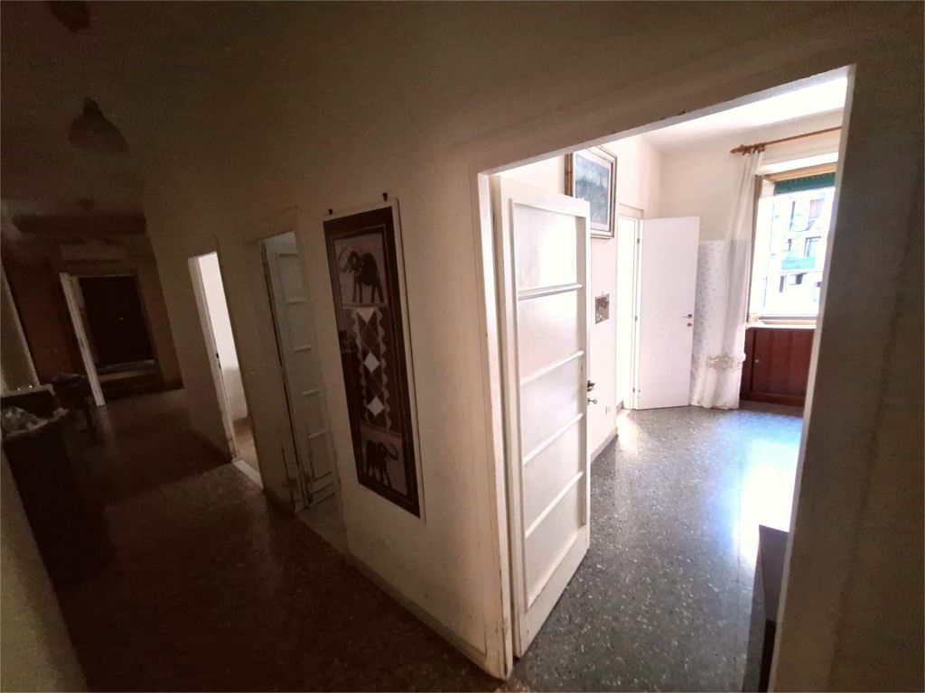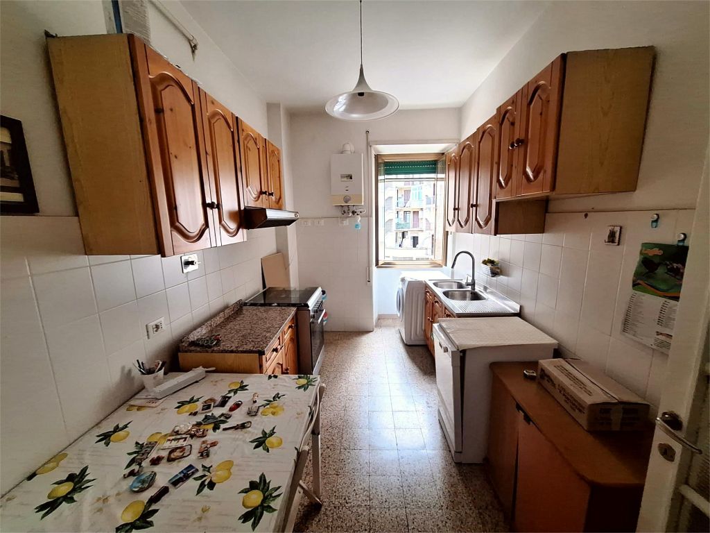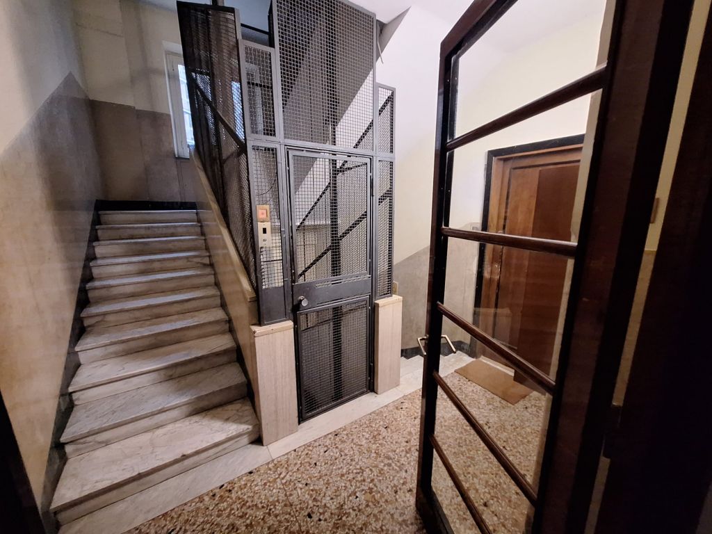 Composto da: ampio ingresso, soggiorno, due camere, cucina abitabile, doppi servizi (di cui uno cieco), ripostiglio ampio. Non ci sono sfoghi esterni. Tutti gli affacci sono interni sulla chiostrina e sul giardino condominiale. Gli infissi sono in alluminio doppio vetro, la porta è blindata e l'esposizione è est-ovest.