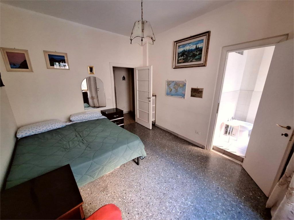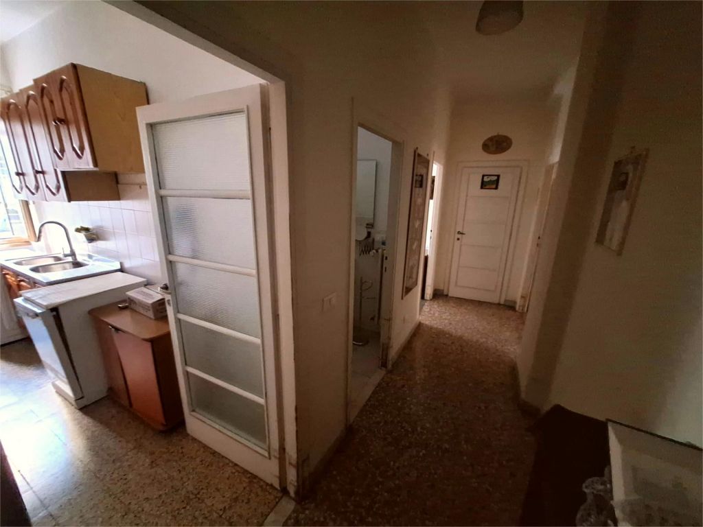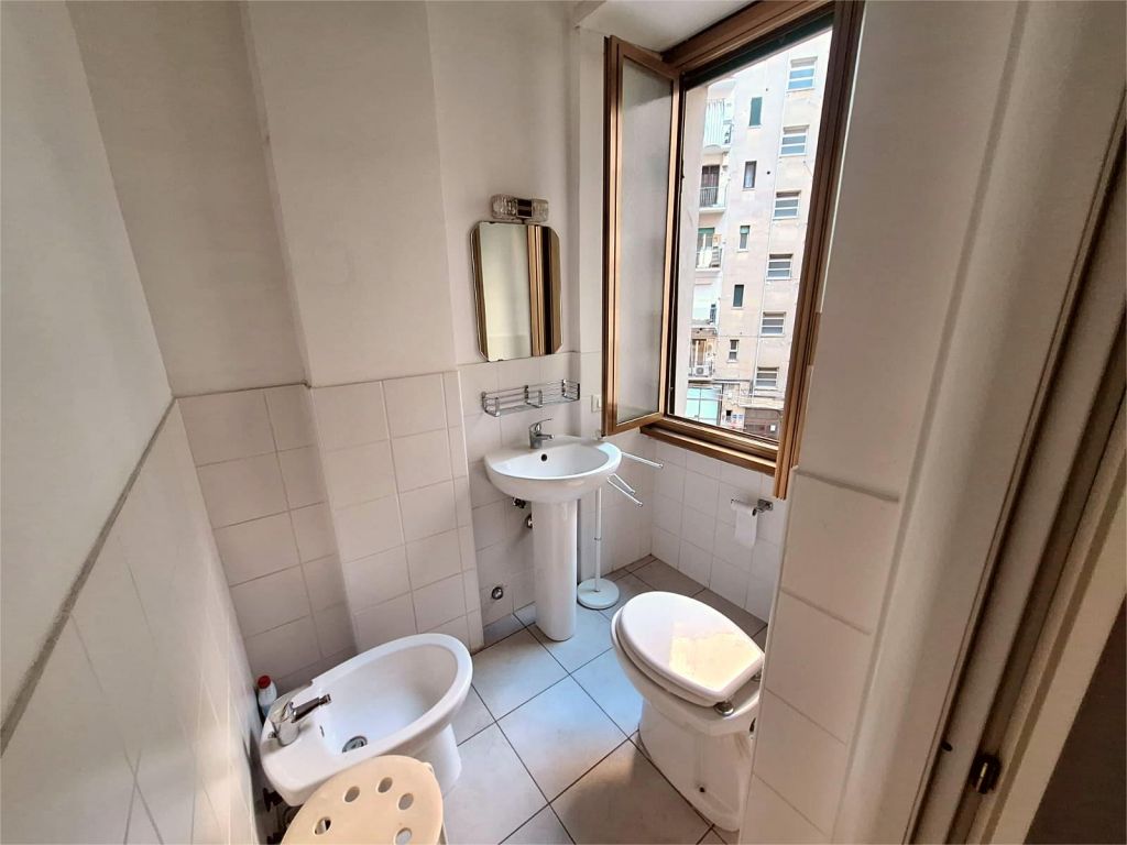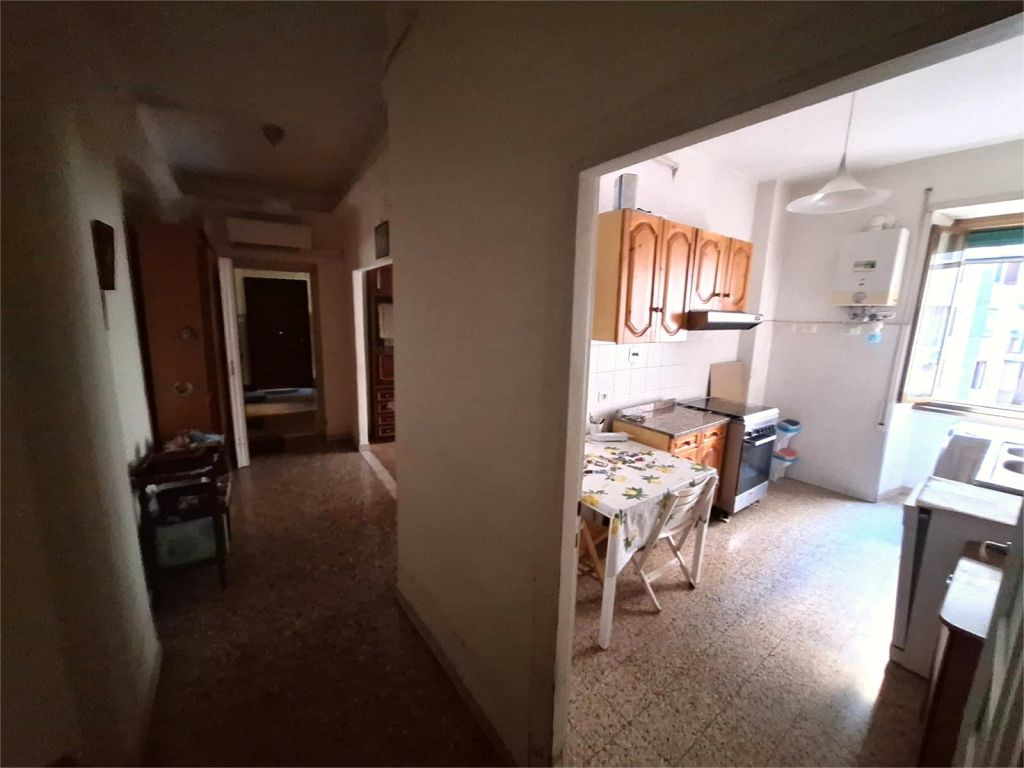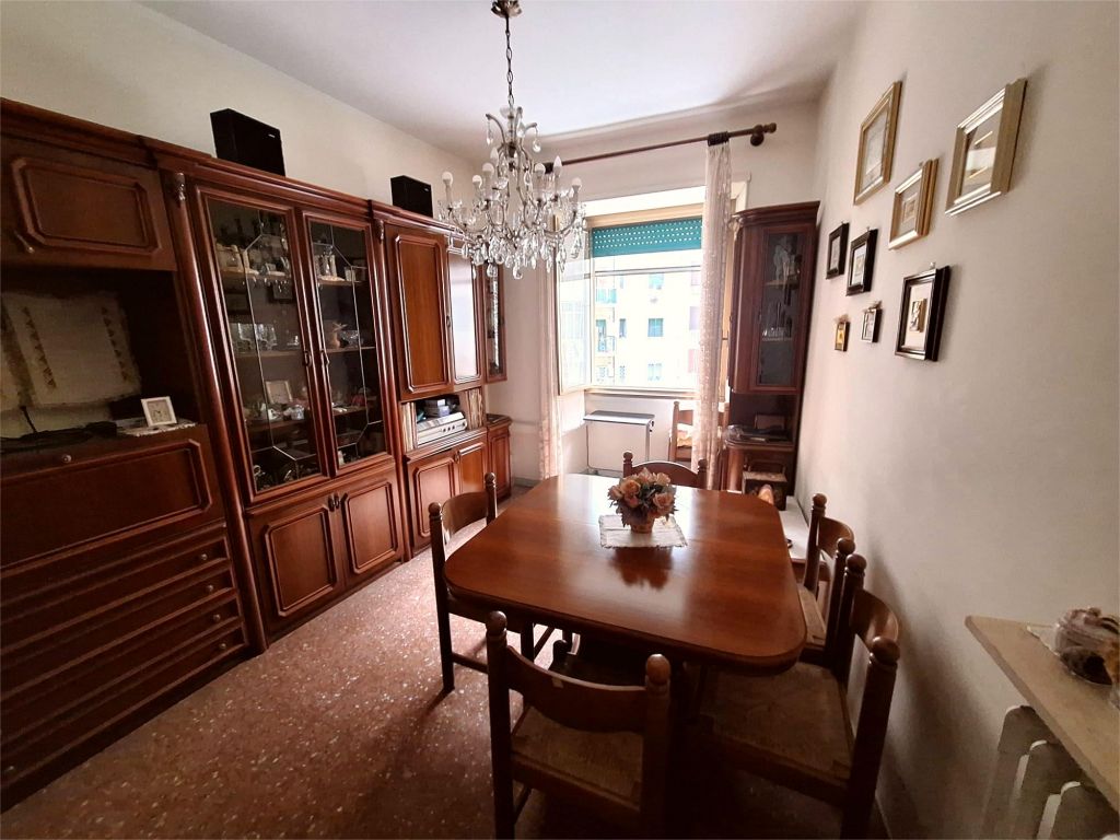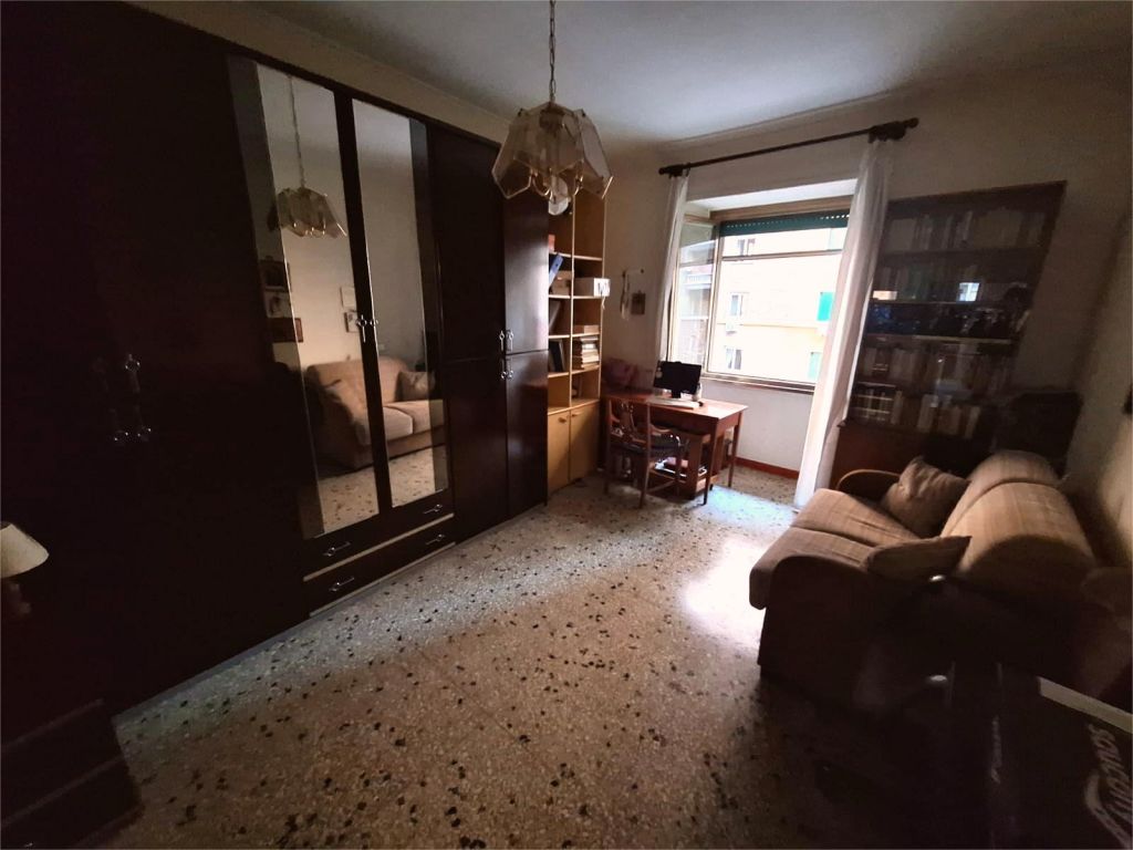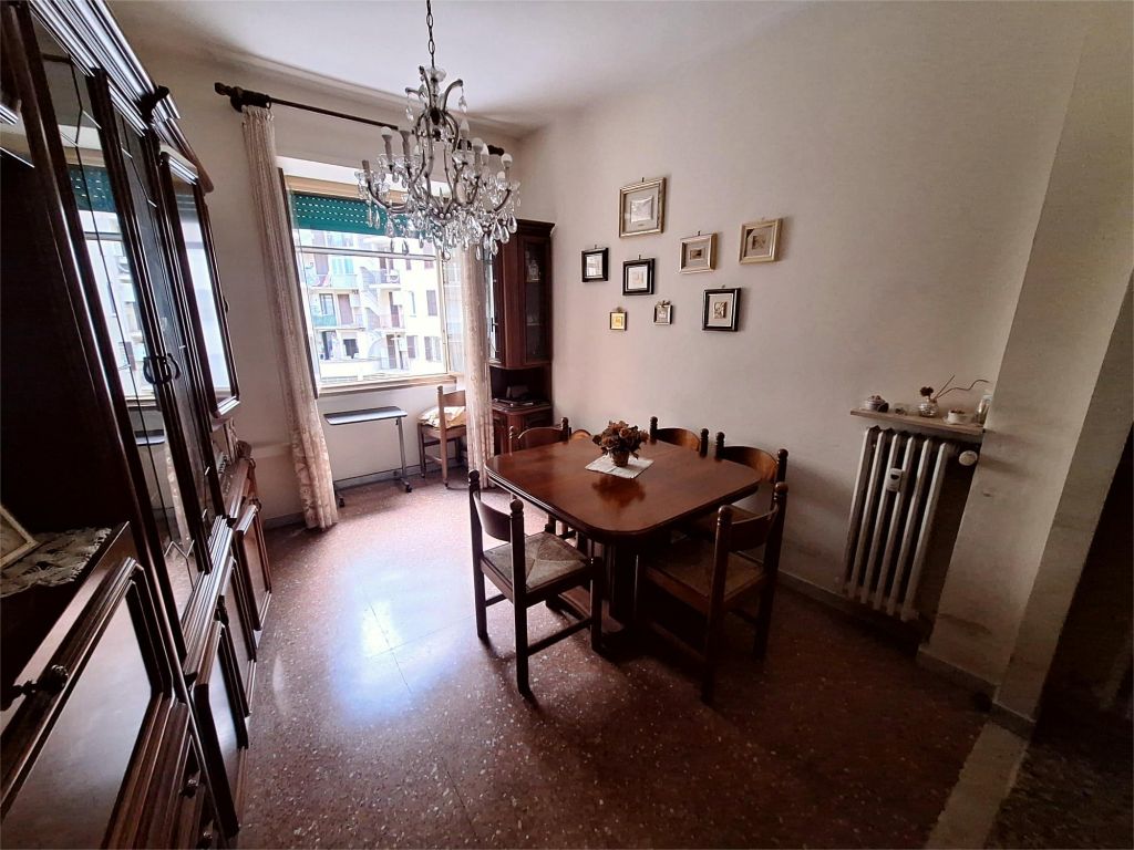 Composto da: ampio ingresso, soggiorno, due camere, cucina abitabile, doppi servizi (di cui uno cieco), ripostiglio ampio. Non ci sono sfoghi esterni. Tutti gli affacci sono interni sulla chiostrina e sul giardino condominiale. Gli infissi sono in alluminio doppio vetro, la porta è blindata e l'esposizione è est-ovest.