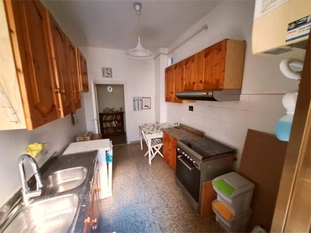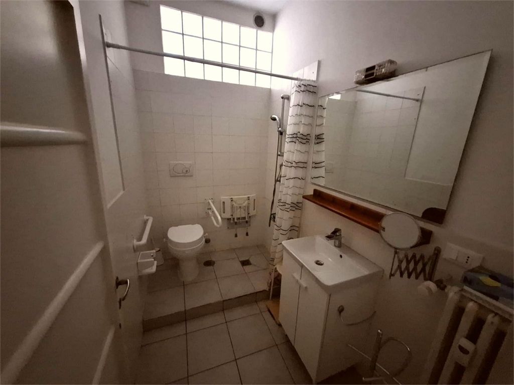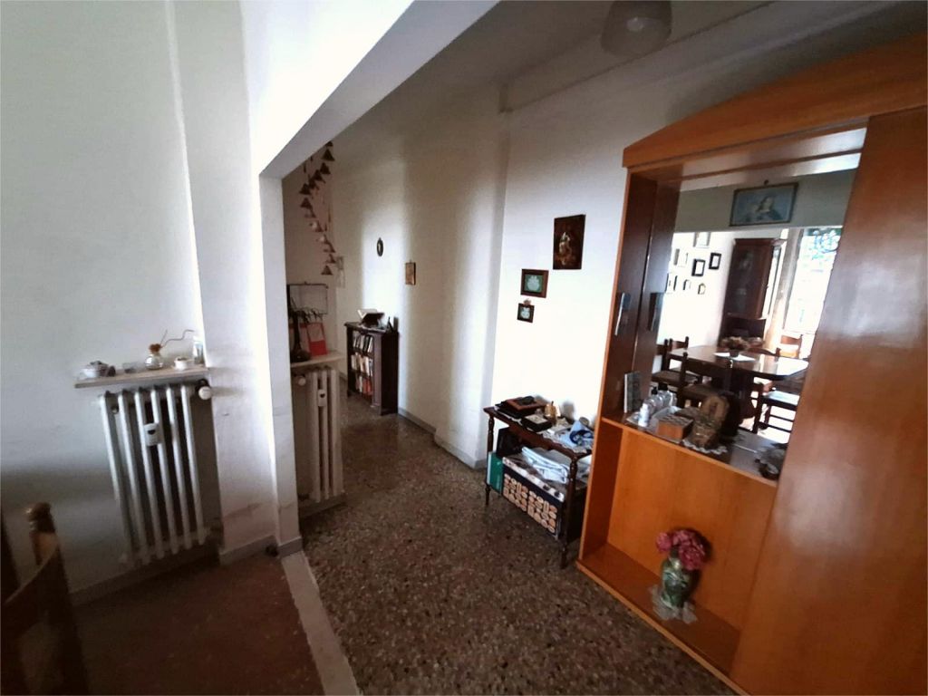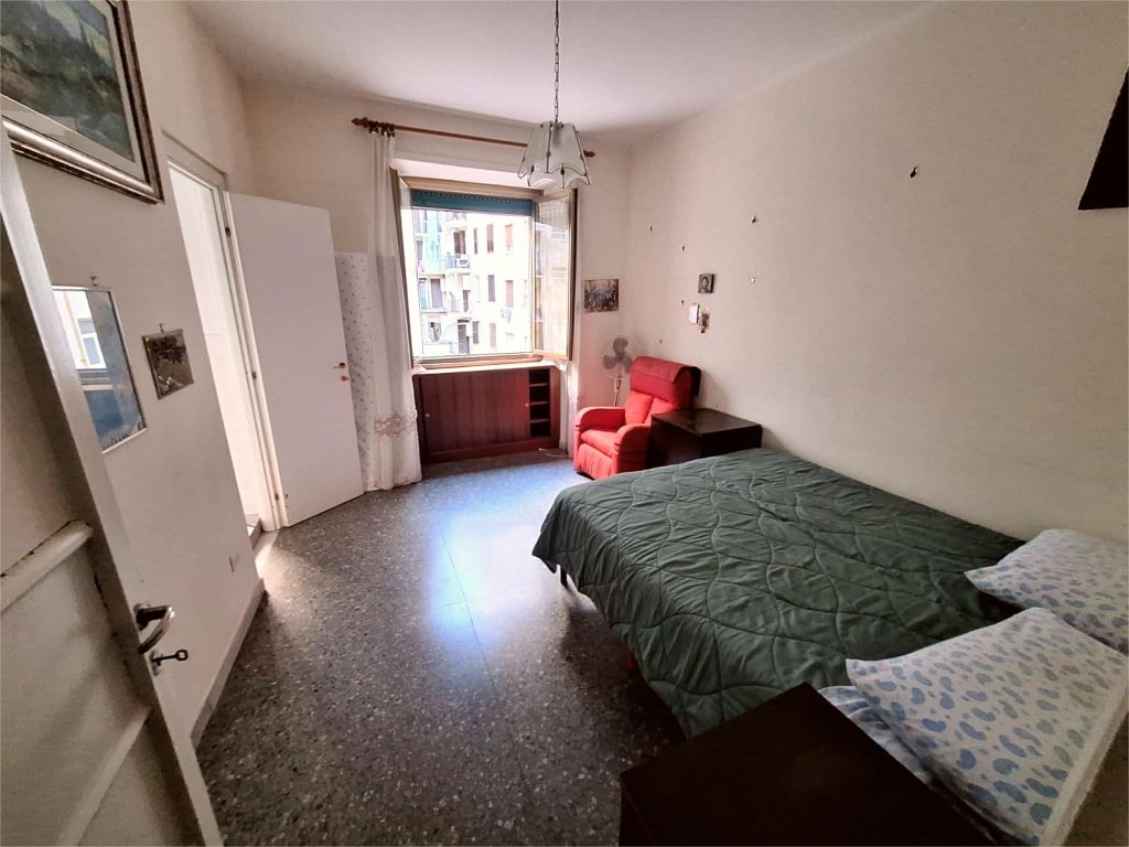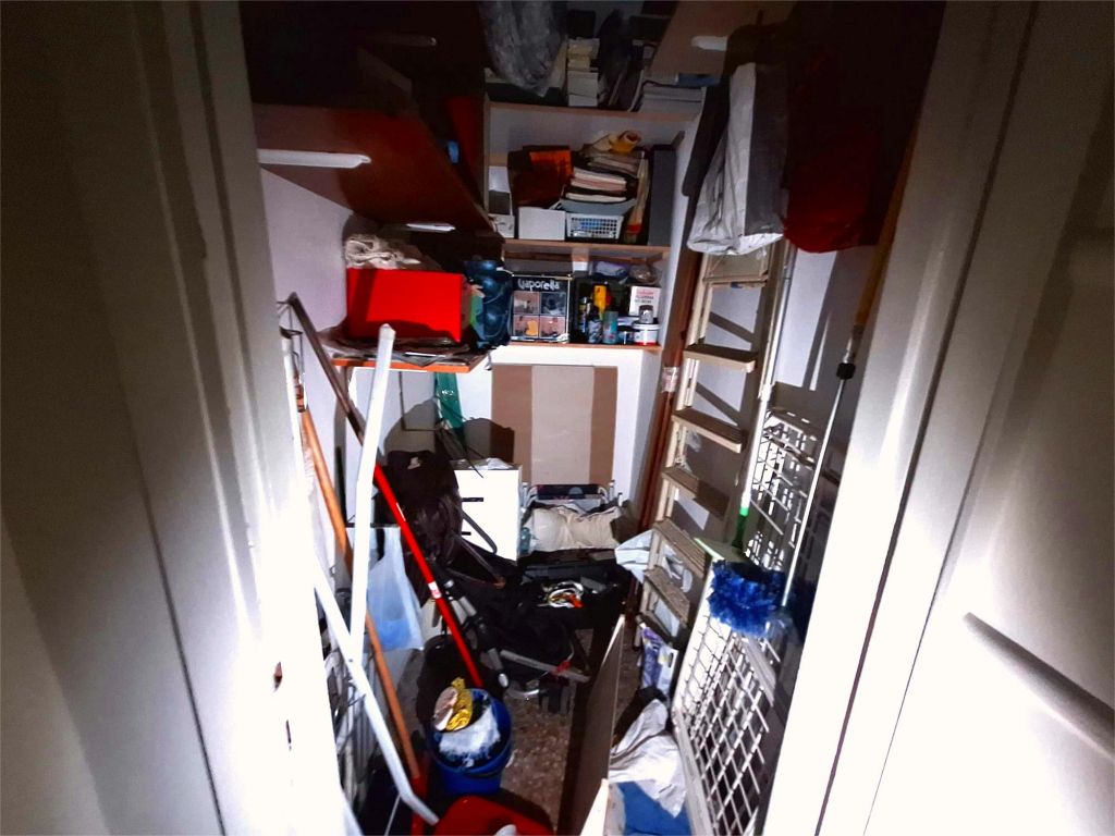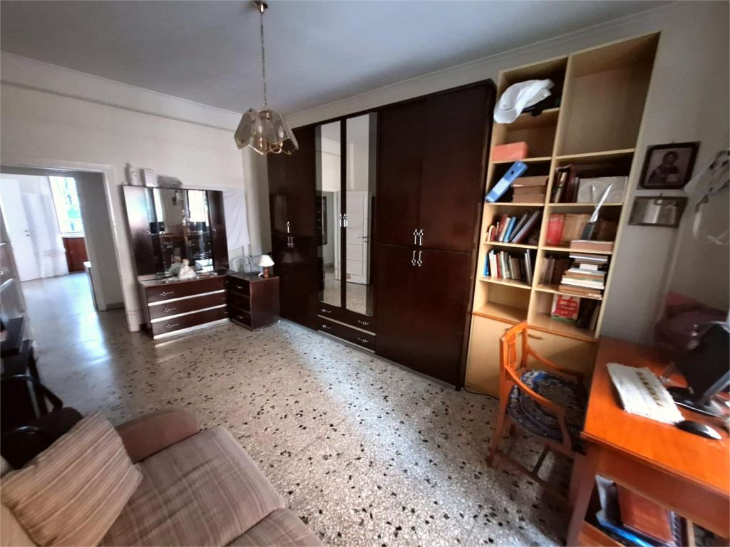 Composto da: ampio ingresso, soggiorno, due camere, cucina abitabile, doppi servizi (di cui uno cieco), ripostiglio ampio. Non ci sono sfoghi esterni. Tutti gli affacci sono interni sulla chiostrina e sul giardino condominiale. Gli infissi sono in alluminio doppio vetro, la porta è blindata e l'esposizione è est-ovest.